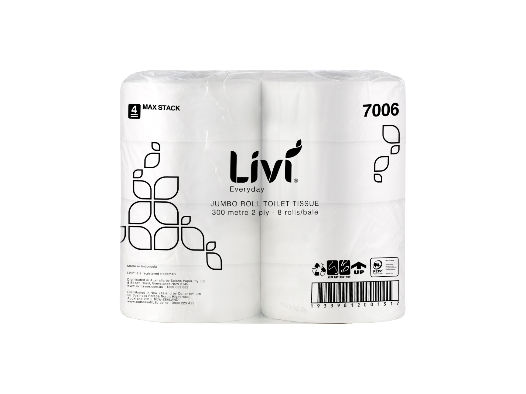 Livi Basics jumbo 2ply toilet paper maximises on standard toilet rolls for convenience and gives you the strength and quality of 2ply toilet paper, along with softness and value. With a continuous roll and toilet paper made from virgin pulp, you are sure to get an excellent product. The toilet roll length is 300m, and there are 8 units to a carton.